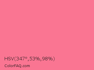 HSV 347°,53%,98% Color is a light red color and the nearest color is Light Crimson #f56991. Hex code #fa7592 and RGB value is rgb(250,117,146). In RGB color space, this color is composed of 98% red, 46% green, 57% blue, In CMYK color space, this color is composed of 0% cyan, 53% magenta, 42% yellow , 2% black , In HSL color space, this color has a hue angle of 347° , 93% saturation and 72% lightness.