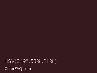 HSV 349°,53%,21% Color is a very dark red color and the nearest color is Jon #3b1f1f. Hex code #36191e and RGB value is rgb(54,25,30). In RGB color space, this color is composed of 21% red, 10% green, 12% blue, In CMYK color space, this color is composed of 0% cyan, 54% magenta, 44% yellow , 79% black , In HSL color space, this color has a hue angle of 350° , 37% saturation and 15% lightness.