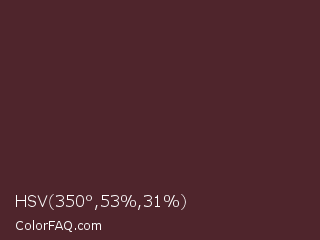 HSV 350°,53%,31% Color is a dark red color and the nearest color is Cowboy #4d282d. Hex code #4f252c and RGB value is rgb(79,37,44). In RGB color space, this color is composed of 31% red, 15% green, 17% blue, In CMYK color space, this color is composed of 0% cyan, 53% magenta, 44% yellow , 69% black , In HSL color space, this color has a hue angle of 350° , 36% saturation and 23% lightness.