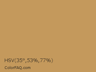 HSV 35°,53%,77% Color is a normal orange color and the nearest color is Twine #c2955d. Hex code #c4995c and RGB value is rgb(196,153,92). In RGB color space, this color is composed of 77% red, 60% green, 36% blue, In CMYK color space, this color is composed of 0% cyan, 22% magenta, 53% yellow , 23% black , In HSL color space, this color has a hue angle of 35° , 47% saturation and 56% lightness.