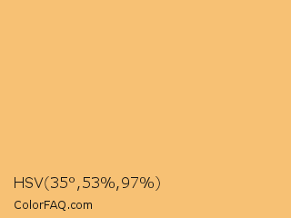 HSV 35°,53%,97% Color is a light orange color and the nearest color is Mellow Apricot #f8b878. Hex code #f7c174 and RGB value is rgb(247,193,116). In RGB color space, this color is composed of 97% red, 76% green, 45% blue, In CMYK color space, this color is composed of 0% cyan, 22% magenta, 53% yellow , 3% black , In HSL color space, this color has a hue angle of 35° , 89% saturation and 71% lightness.