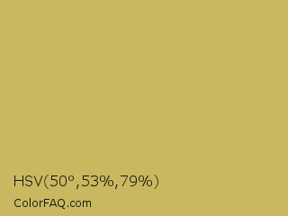 HSV 50°,53%,79% Color is a normal yellow color and the nearest color is Sundance #c9b35b. Hex code #c9b85f and RGB value is rgb(201,184,95). In RGB color space, this color is composed of 79% red, 72% green, 37% blue, In CMYK color space, this color is composed of 0% cyan, 8% magenta, 53% yellow , 21% black , In HSL color space, this color has a hue angle of 50° , 50% saturation and 58% lightness.