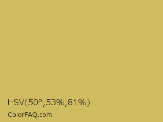 HSV 50°,53%,81% Color is a normal yellow color and the nearest color is Tacha #d6c562. Hex code #cfbc61 and RGB value is rgb(207,188,97). In RGB color space, this color is composed of 81% red, 74% green, 38% blue, In CMYK color space, this color is composed of 0% cyan, 9% magenta, 53% yellow , 19% black , In HSL color space, this color has a hue angle of 50° , 53% saturation and 60% lightness.