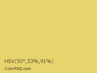 HSV 50°,53%,91% Color is a light yellow color and the nearest color is Hansa Yellow #e9d66b. Hex code #e8d46d and RGB value is rgb(232,212,109). In RGB color space, this color is composed of 91% red, 83% green, 43% blue, In CMYK color space, this color is composed of 0% cyan, 9% magenta, 53% yellow , 9% black , In HSL color space, this color has a hue angle of 50° , 73% saturation and 67% lightness.