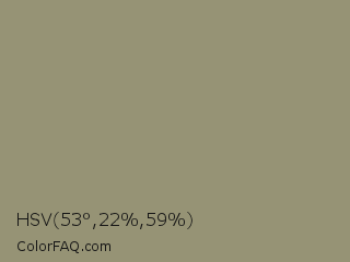 HSV 53°,22%,59% Color is a normal yellow color and the nearest color is Gurkha #9a9577. Hex code #969375 and RGB value is rgb(150,147,117). In RGB color space, this color is composed of 59% red, 58% green, 46% blue, In CMYK color space, this color is composed of 0% cyan, 2% magenta, 22% yellow , 41% black , In HSL color space, this color has a hue angle of 55° , 14% saturation and 52% lightness.