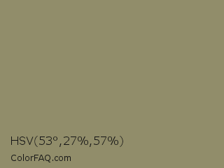 HSV 53°,27%,57% Color is a normal yellow color and the nearest color is Arrowtown #948771. Hex code #918d6a and RGB value is rgb(145,141,106). In RGB color space, this color is composed of 57% red, 55% green, 42% blue, In CMYK color space, this color is composed of 0% cyan, 3% magenta, 27% yellow , 43% black , In HSL color space, this color has a hue angle of 54° , 16% saturation and 49% lightness.