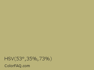 HSV 53°,35%,73% Color is a normal yellow color and the nearest color is Misty Moss #bbb477. Hex code #bab379 and RGB value is rgb(186,179,121). In RGB color space, this color is composed of 73% red, 70% green, 47% blue, In CMYK color space, this color is composed of 0% cyan, 4% magenta, 35% yellow , 27% black , In HSL color space, this color has a hue angle of 54° , 32% saturation and 60% lightness.