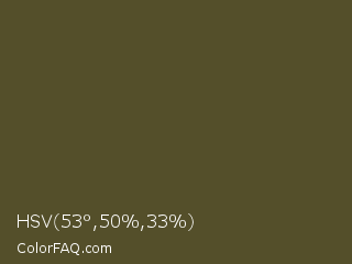 HSV 53°,50%,33% Color is a dark yellow color and the nearest color is Woodland #4d5328. Hex code #544f2a and RGB value is rgb(84,79,42). In RGB color space, this color is composed of 33% red, 31% green, 16% blue, In CMYK color space, this color is composed of 0% cyan, 6% magenta, 50% yellow , 67% black , In HSL color space, this color has a hue angle of 53° , 33% saturation and 25% lightness.