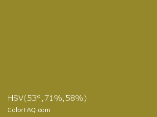 HSV 53°,71%,58% Color is a normal yellow color and the nearest color is Sycamore #908d39. Hex code #94882b and RGB value is rgb(148,136,43). In RGB color space, this color is composed of 58% red, 53% green, 17% blue, In CMYK color space, this color is composed of 0% cyan, 8% magenta, 71% yellow , 42% black , In HSL color space, this color has a hue angle of 53° , 55% saturation and 37% lightness.