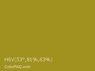 HSV 53°,81%,63% Color is a normal yellow color and the nearest color is Reef Gold #9f821c. Hex code #a1911f and RGB value is rgb(161,145,31). In RGB color space, this color is composed of 63% red, 57% green, 12% blue, In CMYK color space, this color is composed of 0% cyan, 10% magenta, 81% yellow , 37% black , In HSL color space, this color has a hue angle of 53° , 68% saturation and 38% lightness.