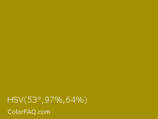 HSV 53°,97%,64% Color is a normal yellow color and the nearest color is Dark Yellow #9b870c. Hex code #a39105 and RGB value is rgb(163,145,5). In RGB color space, this color is composed of 64% red, 57% green, 2% blue, In CMYK color space, this color is composed of 0% cyan, 11% magenta, 97% yellow , 36% black , In HSL color space, this color has a hue angle of 53° , 94% saturation and 33% lightness.