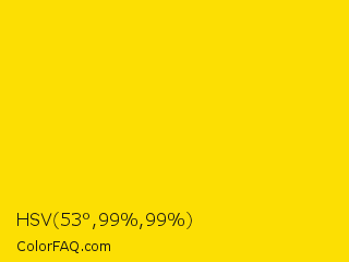 HSV 53°,99%,99% Color is a normal yellow color and the nearest color is Yellow Pantone #fedf00. Hex code #fcdf03 and RGB value is rgb(252,223,3). In RGB color space, this color is composed of 99% red, 87% green, 1% blue, In CMYK color space, this color is composed of 0% cyan, 12% magenta, 99% yellow , 1% black , In HSL color space, this color has a hue angle of 53° , 98% saturation and 50% lightness.