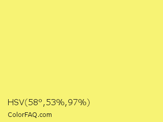HSV 58°,53%,97% Color is a light yellow color and the nearest color is Sunny #f2f27a. Hex code #f7f374 and RGB value is rgb(247,243,116). In RGB color space, this color is composed of 97% red, 95% green, 45% blue, In CMYK color space, this color is composed of 0% cyan, 2% magenta, 53% yellow , 3% black , In HSL color space, this color has a hue angle of 58° , 89% saturation and 71% lightness.