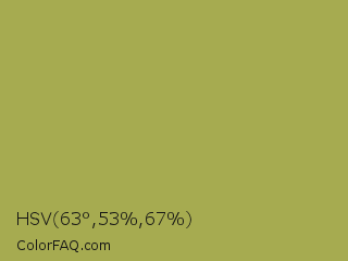HSV 63°,53%,67% Color is a normal yellow color and the nearest color is Husk #b7a458. Hex code #a6ab50 and RGB value is rgb(166,171,80). In RGB color space, this color is composed of 65% red, 67% green, 31% blue, In CMYK color space, this color is composed of 3% cyan, 0% magenta, 53% yellow , 33% black , In HSL color space, this color has a hue angle of 63° , 36% saturation and 49% lightness.