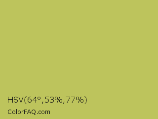 HSV 64°,53%,77% Color is a normal yellow color and the nearest color is Celery #b8c25d. Hex code #bdc45c and RGB value is rgb(189,196,92). In RGB color space, this color is composed of 74% red, 77% green, 36% blue, In CMYK color space, this color is composed of 4% cyan, 0% magenta, 53% yellow , 23% black , In HSL color space, this color has a hue angle of 64° , 47% saturation and 56% lightness.