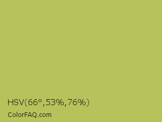 HSV 66°,53%,76% Color is a normal yellow color and the nearest color is Celery #b8c25d. Hex code #b8c25b and RGB value is rgb(184,194,91). In RGB color space, this color is composed of 72% red, 76% green, 36% blue, In CMYK color space, this color is composed of 5% cyan, 0% magenta, 53% yellow , 24% black , In HSL color space, this color has a hue angle of 66° , 46% saturation and 56% lightness.