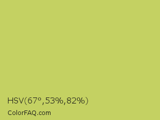 HSV 67°,53%,82% Color is a normal yellow color and the nearest color is June Bud #bdda57. Hex code #c4d162 and RGB value is rgb(196,209,98). In RGB color space, this color is composed of 77% red, 82% green, 38% blue, In CMYK color space, this color is composed of 6% cyan, 0% magenta, 53% yellow , 18% black , In HSL color space, this color has a hue angle of 67° , 55% saturation and 60% lightness.