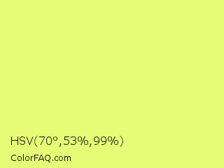 HSV 70°,53%,99% Color is a light yellow color and the nearest color is Honeysuckle #edfc84. Hex code #e6fc77 and RGB value is rgb(230,252,119). In RGB color space, this color is composed of 90% red, 99% green, 47% blue, In CMYK color space, this color is composed of 9% cyan, 0% magenta, 53% yellow , 1% black , In HSL color space, this color has a hue angle of 70° , 96% saturation and 73% lightness.
