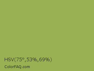 HSV 75°,53%,69% Color is a normal lime color and the nearest color is Chelsea Cucumber #83aa5d. Hex code #99b053 and RGB value is rgb(153,176,83). In RGB color space, this color is composed of 60% red, 69% green, 33% blue, In CMYK color space, this color is composed of 13% cyan, 0% magenta, 53% yellow , 31% black , In HSL color space, this color has a hue angle of 75° , 37% saturation and 51% lightness.