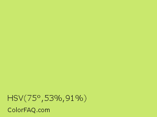 HSV 75°,53%,91% Color is a light lime color and the nearest color is Yellow Green #c5e17a. Hex code #c9e86d and RGB value is rgb(201,232,109). In RGB color space, this color is composed of 79% red, 91% green, 43% blue, In CMYK color space, this color is composed of 13% cyan, 0% magenta, 53% yellow , 9% black , In HSL color space, this color has a hue angle of 75° , 73% saturation and 67% lightness.