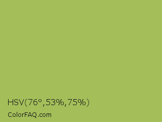 HSV 76°,53%,75% Color is a normal lime color and the nearest color is Middle Green Yellow #acbf60. Hex code #a4bf5a and RGB value is rgb(164,191,90). In RGB color space, this color is composed of 64% red, 75% green, 35% blue, In CMYK color space, this color is composed of 14% cyan, 0% magenta, 53% yellow , 25% black , In HSL color space, this color has a hue angle of 76° , 44% saturation and 55% lightness.