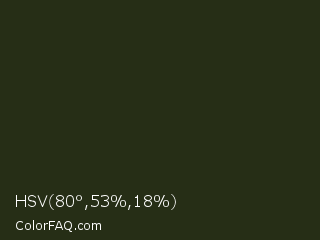 HSV 80°,53%,18% Color is a very dark green color and the nearest color is Black Olive #242e16. Hex code #262e16 and RGB value is rgb(38,46,22). In RGB color space, this color is composed of 15% red, 18% green, 9% blue, In CMYK color space, this color is composed of 17% cyan, 0% magenta, 52% yellow , 82% black , In HSL color space, this color has a hue angle of 80° , 35% saturation and 13% lightness.