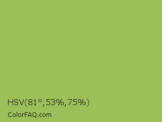HSV 81°,53%,75% Color is a normal green color and the nearest color is Middle Green Yellow #acbf60. Hex code #9cbf5a and RGB value is rgb(156,191,90). In RGB color space, this color is composed of 61% red, 75% green, 35% blue, In CMYK color space, this color is composed of 18% cyan, 0% magenta, 53% yellow , 25% black , In HSL color space, this color has a hue angle of 81° , 44% saturation and 55% lightness.