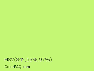 HSV 84°,53%,97% Color is a light green color and the nearest color is Sulu #c1f07c. Hex code #c3f774 and RGB value is rgb(195,247,116). In RGB color space, this color is composed of 76% red, 97% green, 45% blue, In CMYK color space, this color is composed of 21% cyan, 0% magenta, 53% yellow , 3% black , In HSL color space, this color has a hue angle of 84° , 89% saturation and 71% lightness.