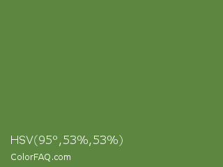 HSV 95°,53%,53% Color is a normal green color and the nearest color is Hippie Green #53824b. Hex code #5d8740 and RGB value is rgb(93,135,64). In RGB color space, this color is composed of 36% red, 53% green, 25% blue, In CMYK color space, this color is composed of 31% cyan, 0% magenta, 53% yellow , 47% black , In HSL color space, this color has a hue angle of 95° , 36% saturation and 39% lightness.