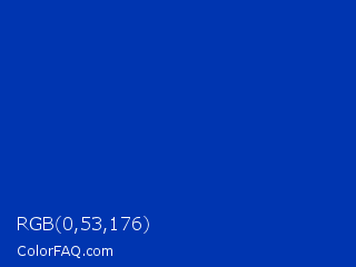 RGB 0,53,176 Color is a normal blue color and the nearest color is UA Blue #0033aa. Hex code #0035b0 and RGB value is rgb(0,53,176). In RGB color space, this color is composed of 0% red, 21% green, 69% blue, In CMYK color space, this color is composed of 100% cyan, 70% magenta, 0% yellow , 31% black , In HSL color space, this color has a hue angle of 222° , 100% saturation and 35% lightness.