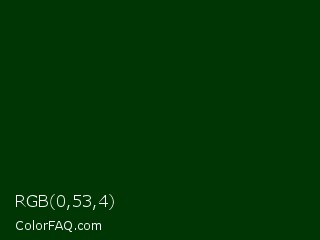 RGB 0,53,4 Color is a very dark green color and the nearest color is Deep Fir #002900. Hex code #003504 and RGB value is rgb(0,53,4). In RGB color space, this color is composed of 0% red, 21% green, 2% blue, In CMYK color space, this color is composed of 100% cyan, 0% magenta, 92% yellow , 79% black , In HSL color space, this color has a hue angle of 125° , 100% saturation and 10% lightness.