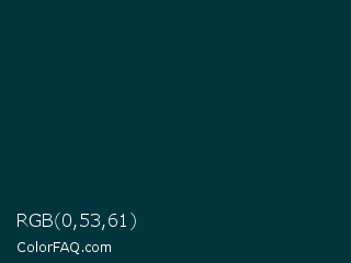 RGB 0,53,61 Color is a very dark cyan color and the nearest color is Tiber #063537. Hex code #00353d and RGB value is rgb(0,53,61). In RGB color space, this color is composed of 0% red, 21% green, 24% blue, In CMYK color space, this color is composed of 100% cyan, 13% magenta, 0% yellow , 76% black , In HSL color space, this color has a hue angle of 188° , 100% saturation and 12% lightness.