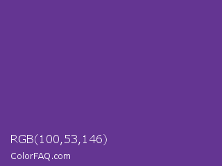 RGB 100,53,146 Color is a normal violet color and the nearest color is Rebecca Purple #663399. Hex code #643592 and RGB value is rgb(100,53,146). In RGB color space, this color is composed of 39% red, 21% green, 57% blue, In CMYK color space, this color is composed of 32% cyan, 64% magenta, 0% yellow , 43% black , In HSL color space, this color has a hue angle of 270° , 47% saturation and 39% lightness.