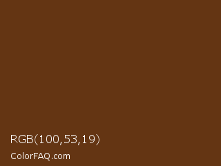 RGB 100,53,19 Color is a dark orange color and the nearest color is Jambalaya #5b3013. Hex code #643513 and RGB value is rgb(100,53,19). In RGB color space, this color is composed of 39% red, 21% green, 7% blue, In CMYK color space, this color is composed of 0% cyan, 47% magenta, 81% yellow , 61% black , In HSL color space, this color has a hue angle of 25° , 68% saturation and 23% lightness.