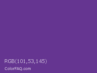 RGB 101,53,145 Color is a normal purple color and the nearest color is Rebecca Purple #663399. Hex code #653591 and RGB value is rgb(101,53,145). In RGB color space, this color is composed of 40% red, 21% green, 57% blue, In CMYK color space, this color is composed of 30% cyan, 63% magenta, 0% yellow , 43% black , In HSL color space, this color has a hue angle of 271° , 46% saturation and 39% lightness.