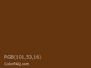 RGB 101,53,16 Color is a dark orange color and the nearest color is Jambalaya #5b3013. Hex code #653510 and RGB value is rgb(101,53,16). In RGB color space, this color is composed of 40% red, 21% green, 6% blue, In CMYK color space, this color is composed of 0% cyan, 48% magenta, 84% yellow , 60% black , In HSL color space, this color has a hue angle of 26° , 73% saturation and 23% lightness.