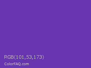 RGB 101,53,173 Color is a normal violet color and the nearest color is Grape #6f2da8. Hex code #6535ad and RGB value is rgb(101,53,173). In RGB color space, this color is composed of 40% red, 21% green, 68% blue, In CMYK color space, this color is composed of 42% cyan, 69% magenta, 0% yellow , 32% black , In HSL color space, this color has a hue angle of 264° , 53% saturation and 44% lightness.