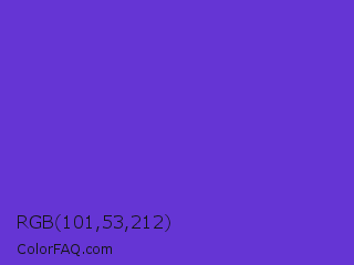 RGB 101,53,212 Color is a normal indigo color and the nearest color is Purple Heart Crayola #652dc1. Hex code #6535d4 and RGB value is rgb(101,53,212). In RGB color space, this color is composed of 40% red, 21% green, 83% blue, In CMYK color space, this color is composed of 52% cyan, 75% magenta, 0% yellow , 17% black , In HSL color space, this color has a hue angle of 258° , 65% saturation and 52% lightness.
