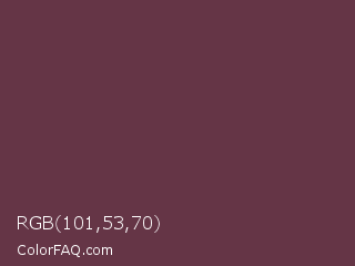 RGB 101,53,70 Color is a dark rose color and the nearest color is Wine Dregs #673147. Hex code #653546 and RGB value is rgb(101,53,70). In RGB color space, this color is composed of 40% red, 21% green, 27% blue, In CMYK color space, this color is composed of 0% cyan, 48% magenta, 31% yellow , 60% black , In HSL color space, this color has a hue angle of 339° , 31% saturation and 30% lightness.