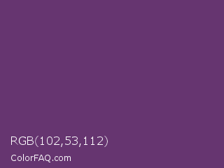 RGB 102,53,112 Color is a normal purple color and the nearest color is Imperial #602f6b. Hex code #663570 and RGB value is rgb(102,53,112). In RGB color space, this color is composed of 40% red, 21% green, 44% blue, In CMYK color space, this color is composed of 9% cyan, 53% magenta, 0% yellow , 56% black , In HSL color space, this color has a hue angle of 290° , 36% saturation and 32% lightness.