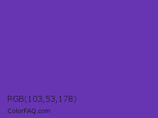 RGB 103,53,178 Color is a normal violet color and the nearest color is Grape #6f2da8. Hex code #6735b2 and RGB value is rgb(103,53,178). In RGB color space, this color is composed of 40% red, 21% green, 70% blue, In CMYK color space, this color is composed of 42% cyan, 70% magenta, 0% yellow , 30% black , In HSL color space, this color has a hue angle of 264° , 54% saturation and 45% lightness.