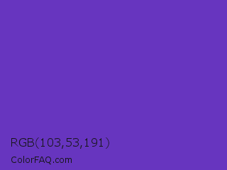 RGB 103,53,191 Color is a normal violet color and the nearest color is Purple Heart Crayola #652dc1. Hex code #6735bf and RGB value is rgb(103,53,191). In RGB color space, this color is composed of 40% red, 21% green, 75% blue, In CMYK color space, this color is composed of 46% cyan, 72% magenta, 0% yellow , 25% black , In HSL color space, this color has a hue angle of 262° , 57% saturation and 48% lightness.