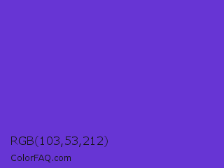 RGB 103,53,212 Color is a normal indigo color and the nearest color is Purple Heart Crayola #652dc1. Hex code #6735d4 and RGB value is rgb(103,53,212). In RGB color space, this color is composed of 40% red, 21% green, 83% blue, In CMYK color space, this color is composed of 51% cyan, 75% magenta, 0% yellow , 17% black , In HSL color space, this color has a hue angle of 259° , 65% saturation and 52% lightness.