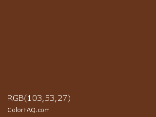 RGB 103,53,27 Color is a dark orange color and the nearest color is Liver Organ #6c2e1f. Hex code #67351b and RGB value is rgb(103,53,27). In RGB color space, this color is composed of 40% red, 21% green, 11% blue, In CMYK color space, this color is composed of 0% cyan, 49% magenta, 74% yellow , 60% black , In HSL color space, this color has a hue angle of 21° , 58% saturation and 25% lightness.