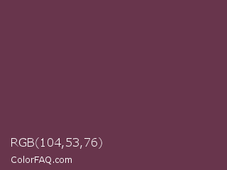 RGB 104,53,76 Color is a normal rose color and the nearest color is Wine Dregs #673147. Hex code #68354c and RGB value is rgb(104,53,76). In RGB color space, this color is composed of 41% red, 21% green, 30% blue, In CMYK color space, this color is composed of 0% cyan, 49% magenta, 27% yellow , 59% black , In HSL color space, this color has a hue angle of 333° , 32% saturation and 31% lightness.