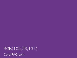 RGB 105,53,137 Color is a normal purple color and the nearest color is Eminence #6c3082. Hex code #693589 and RGB value is rgb(105,53,137). In RGB color space, this color is composed of 41% red, 21% green, 54% blue, In CMYK color space, this color is composed of 23% cyan, 61% magenta, 0% yellow , 46% black , In HSL color space, this color has a hue angle of 277° , 44% saturation and 37% lightness.