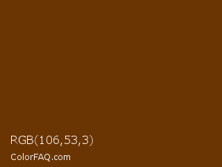 RGB 106,53,3 Color is a very dark orange color and the nearest color is Nutmeg Wood Finish #683600. Hex code #6a3503 and RGB value is rgb(106,53,3). In RGB color space, this color is composed of 42% red, 21% green, 1% blue, In CMYK color space, this color is composed of 0% cyan, 50% magenta, 97% yellow , 58% black , In HSL color space, this color has a hue angle of 29° , 94% saturation and 21% lightness.