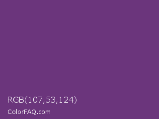 RGB 107,53,124 Color is a normal purple color and the nearest color is Eminence #6c3082. Hex code #6b357c and RGB value is rgb(107,53,124). In RGB color space, this color is composed of 42% red, 21% green, 49% blue, In CMYK color space, this color is composed of 14% cyan, 57% magenta, 0% yellow , 51% black , In HSL color space, this color has a hue angle of 286° , 40% saturation and 35% lightness.