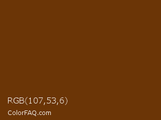 RGB 107,53,6 Color is a very dark orange color and the nearest color is Nutmeg Wood Finish #683600. Hex code #6b3506 and RGB value is rgb(107,53,6). In RGB color space, this color is composed of 42% red, 21% green, 2% blue, In CMYK color space, this color is composed of 0% cyan, 50% magenta, 94% yellow , 58% black , In HSL color space, this color has a hue angle of 28° , 89% saturation and 22% lightness.