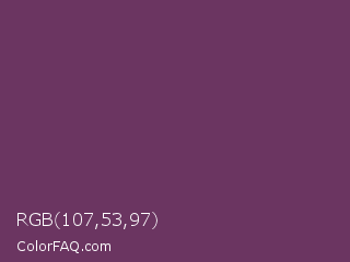 RGB 107,53,97 Color is a normal magenta color and the nearest color is Cosmic #76395d. Hex code #6b3561 and RGB value is rgb(107,53,97). In RGB color space, this color is composed of 42% red, 21% green, 38% blue, In CMYK color space, this color is composed of 0% cyan, 50% magenta, 9% yellow , 58% black , In HSL color space, this color has a hue angle of 311° , 34% saturation and 31% lightness.